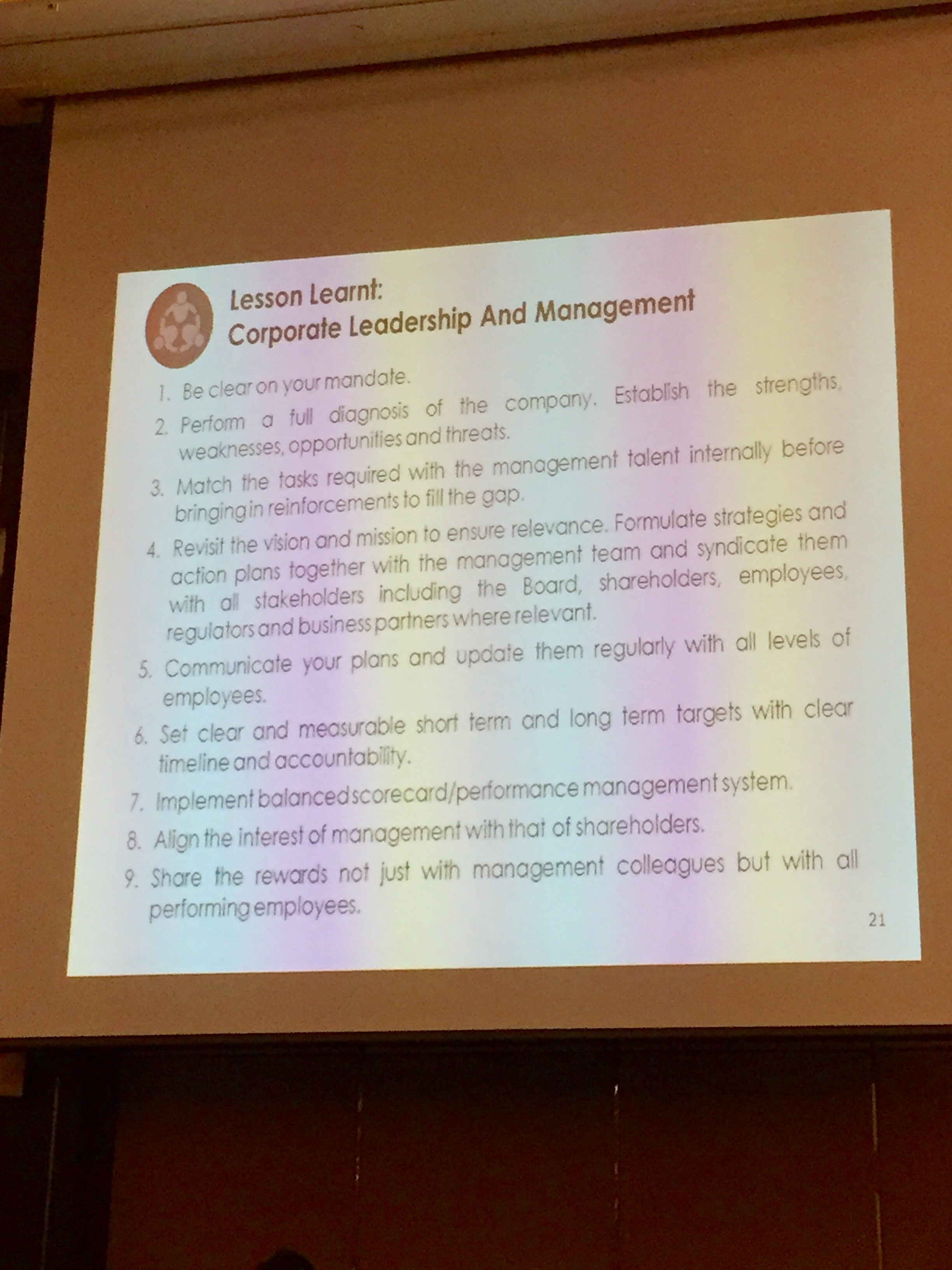 Tan Sri shared his lessons learnt in personal leadership, corporate leadership and management. These principles I believe, make for great personal reflection regardless of where you are in your career, a young executive, middle manager or even a CEO: